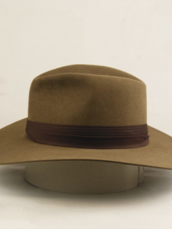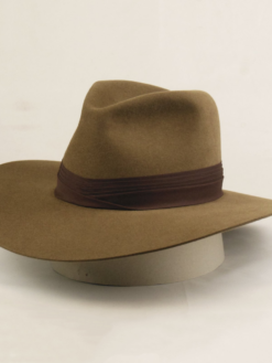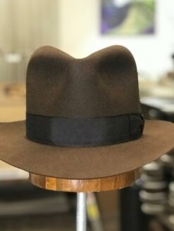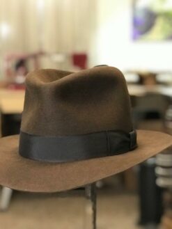 Inspired by a classic adventure character, this hat is a stylish replica of a timeless design. Made from whiskey wool felt, it features a 5 1/2″ open crown with a center crease and medium pinches for a sophisticated look. The dark brown hand-wrapped puggaree band adds an elegant touch, while the 4″ safari-style brim offers both shade and flair. Perfect for those who appreciate vintage-inspired headwear.