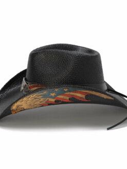 Black Eagle Straw Cowboy Hat, It has a 3 1/2″ brim and a 4 1/4″ pinch front teardrop crown. It features a quality Panama Straw and USA logo with wings and stars buckle. This one-of-a-kind piece makes a bold statement of patriotism.Lightweight and durable, it’s unlined for breathability.