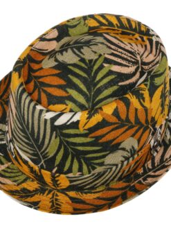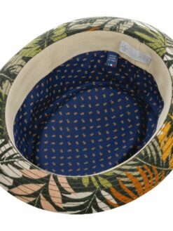 Colourful leaves on a dark background and skin-friendly materials make the pork pie hat a summer hit. With a 100% linen upper and breathable cotton lining, it is comfortable to wear and provides good heat and moisture exchange on hot days. The upward curved brim gives the fabric hat its characteristic appearance.