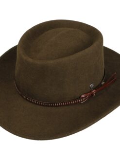 The strikingly decorated trim band of this Western hat immediately catches everyone’s eye. The fine vertical lines and the slightly protruding bow set an elegant accent and make the traveller hat a fashionable going-out hat for the city. Of course, the comfortable head covering made of 100% wool felt can also be worn while gardening or relaxing in the hammock.