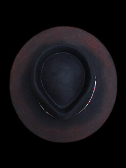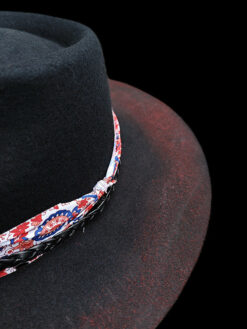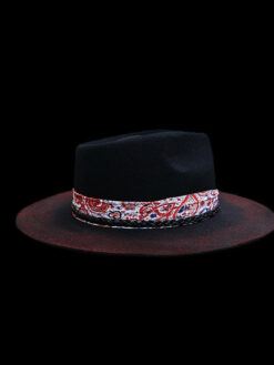“Distressed Fedora with Red and White Patterned Band” is hand-distressed, hand-dyed, and hand-torched, ensuring no two share the same color or design. Each piece is uniquely imperfect, with subtle variations from product images.