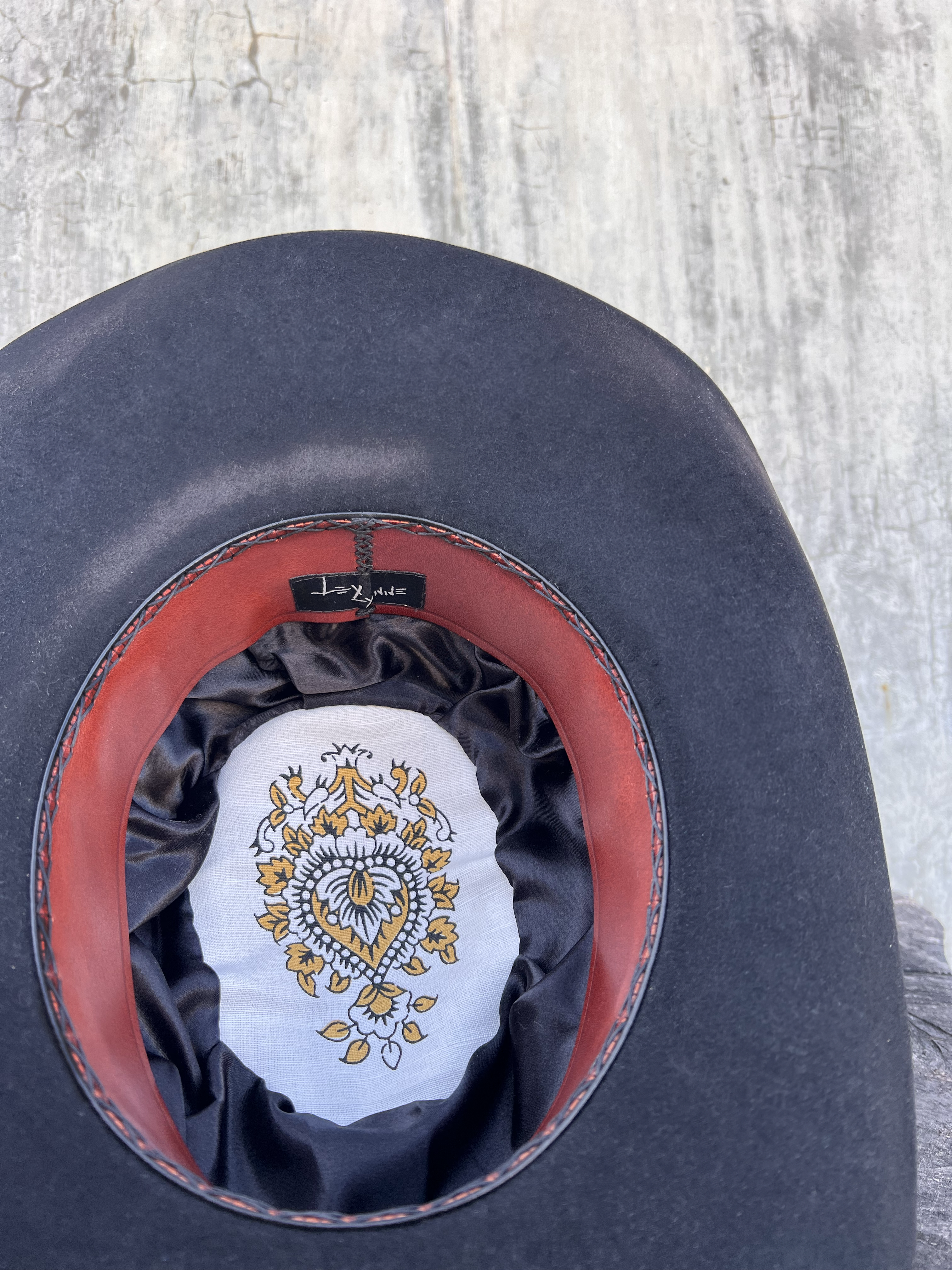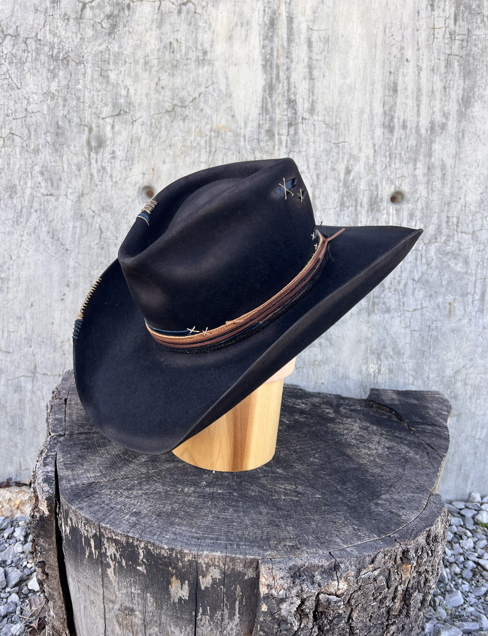 “Ebony Blue Vintage Felt Cowboy Hat” is hand-distressed, hand-dyed, and hand-torched, ensuring no two share the same color or design. Each piece is uniquely imperfect, with subtle variations from product images.