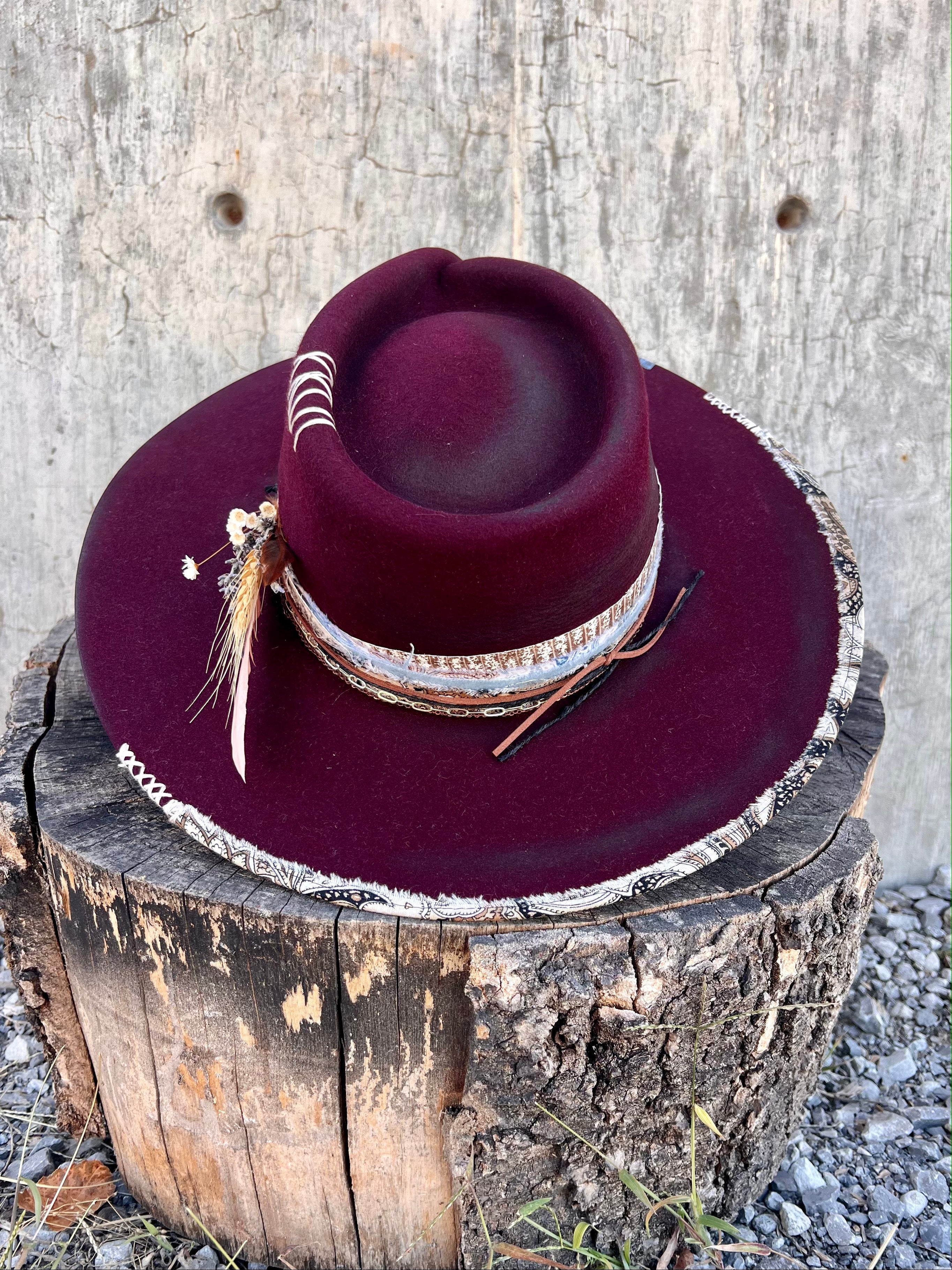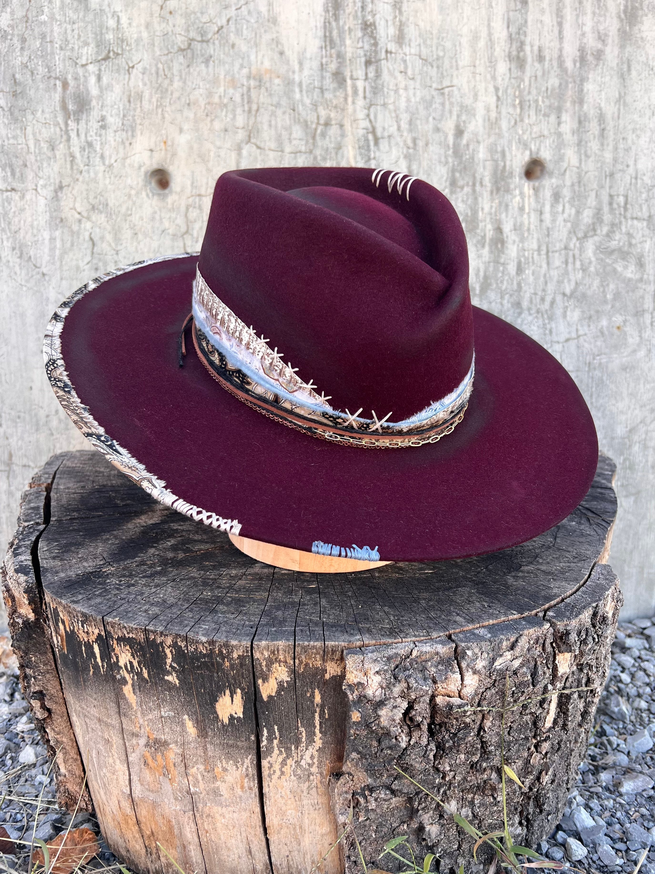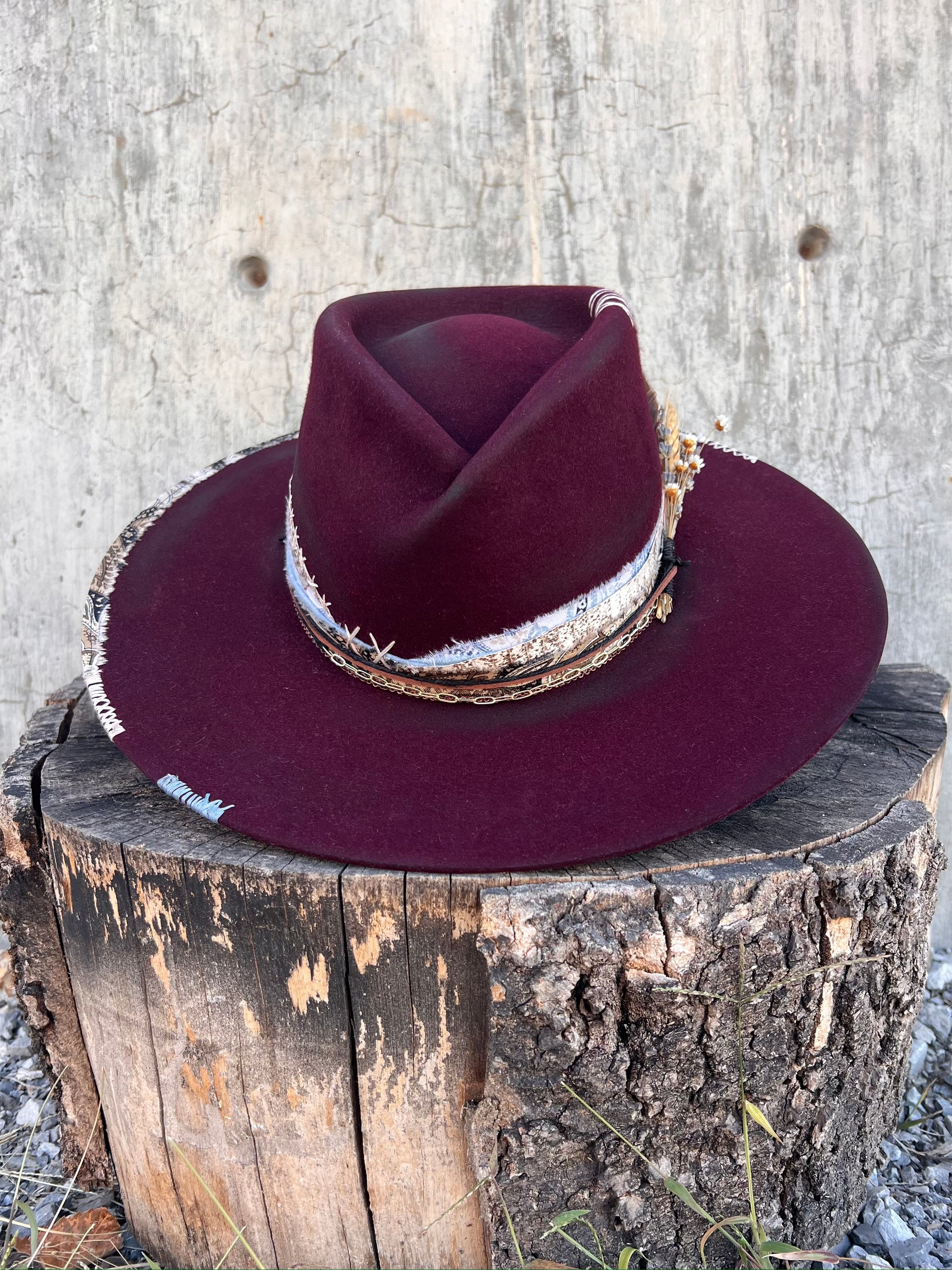 “Mulled Wine Vintage Felt Wide Brim Hat” is hand-distressed, hand-dyed, and hand-torched, ensuring no two share the same color or design. Each piece is uniquely imperfect, with subtle variations from product images.