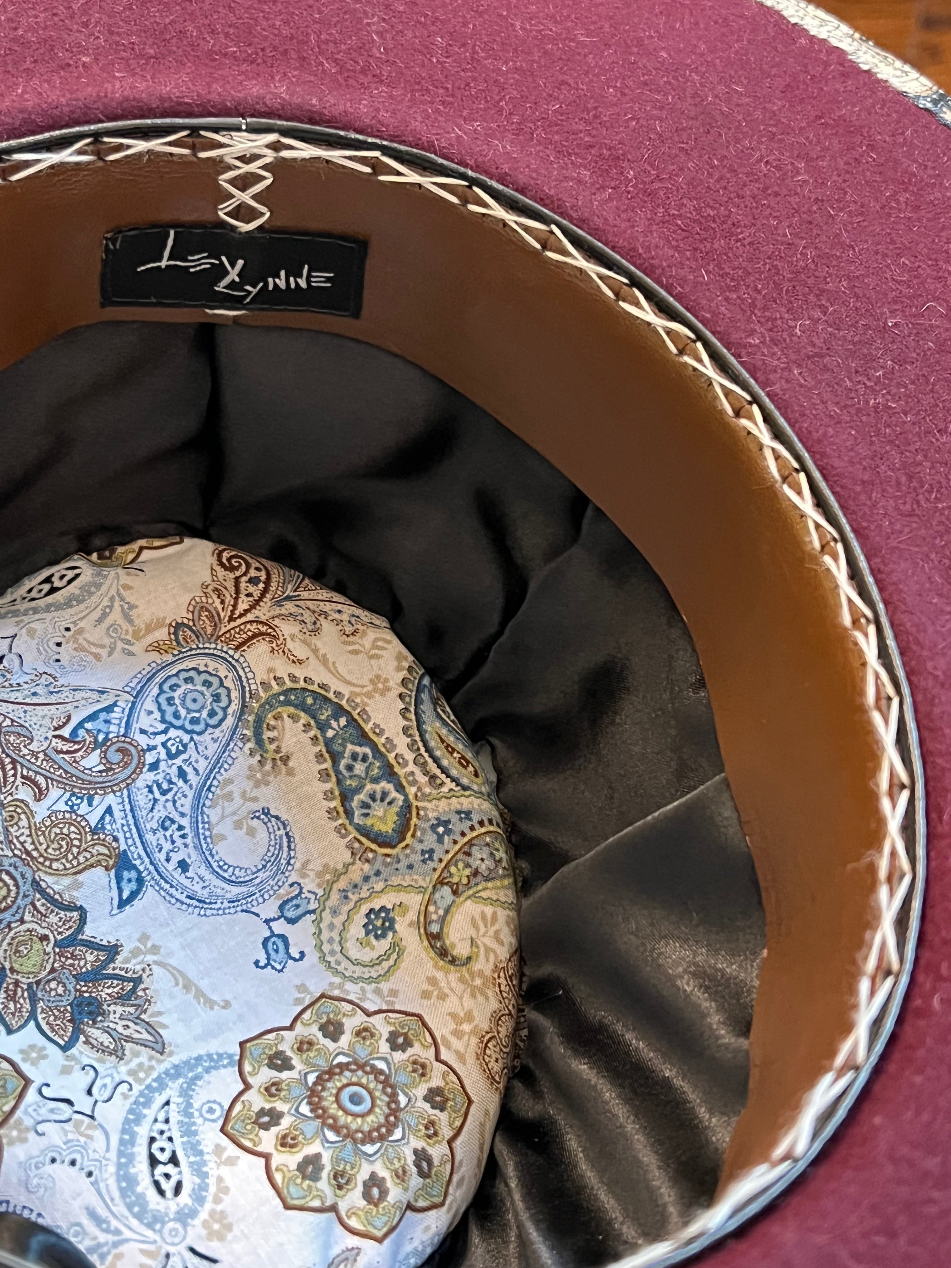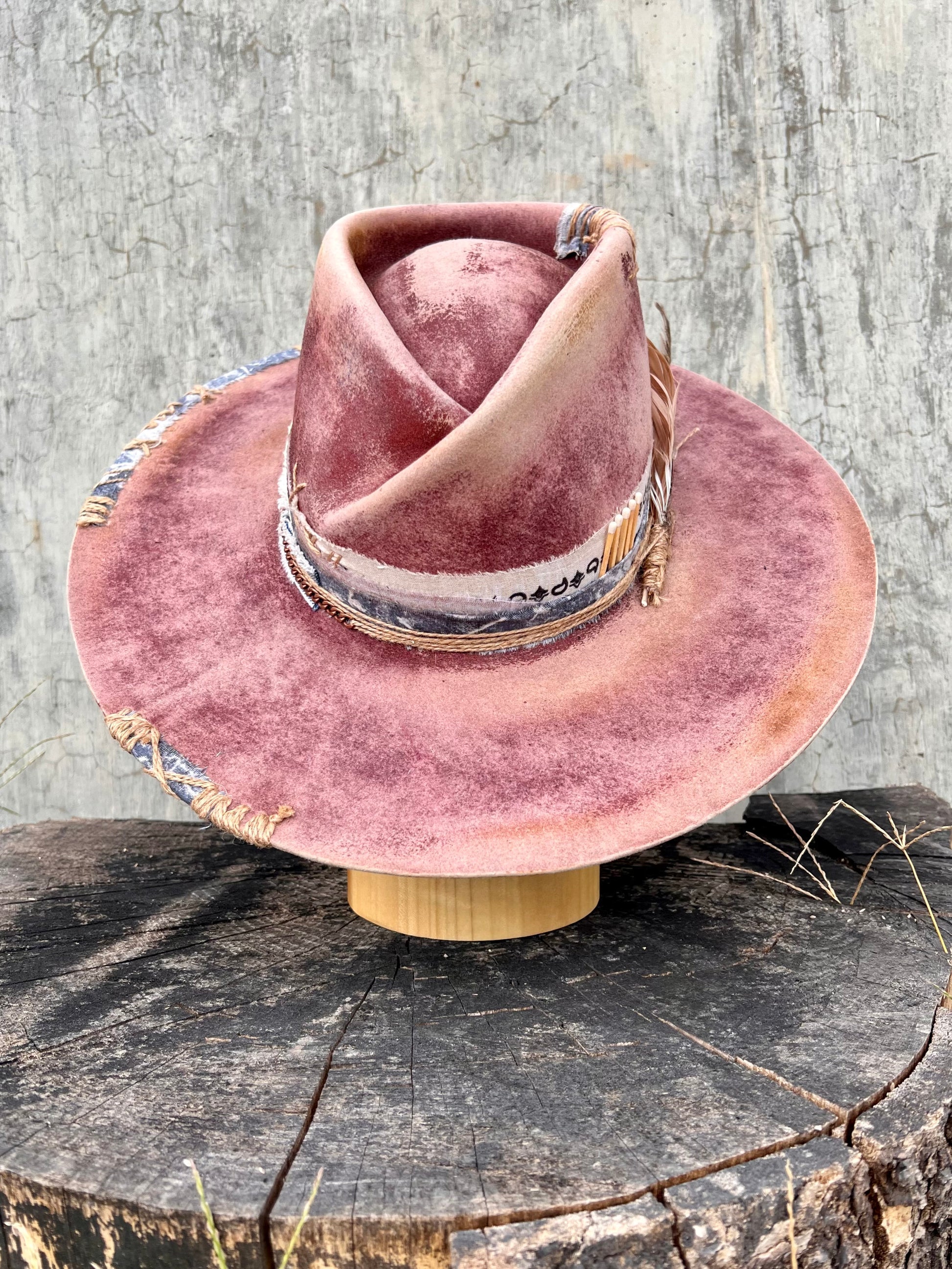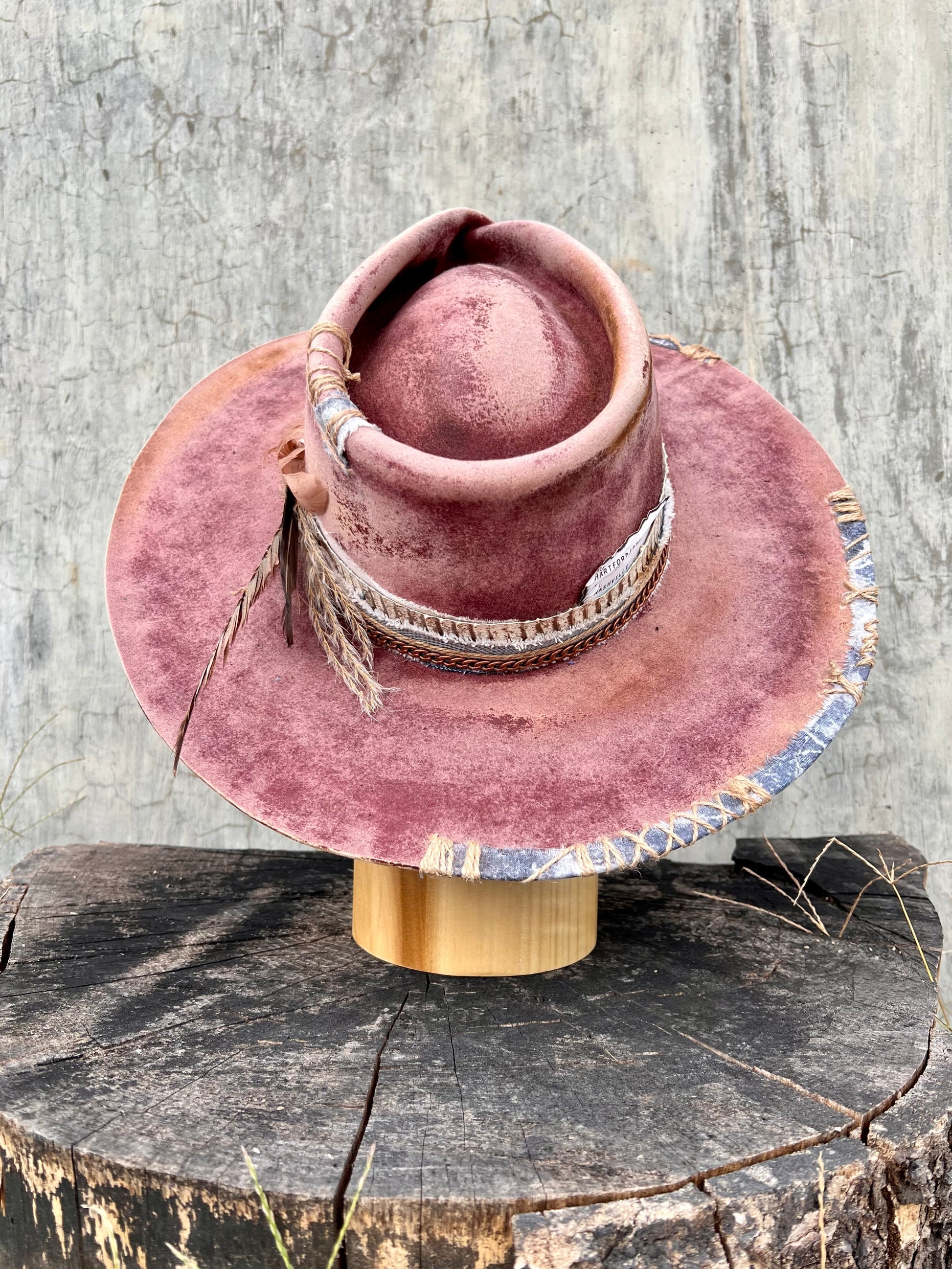 “Mulled Wine Vintage Felt Wide Brim Hat” is hand-distressed, hand-dyed, and hand-torched, ensuring no two share the same color or design. Each piece is uniquely imperfect, with subtle variations from product images.
