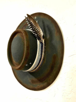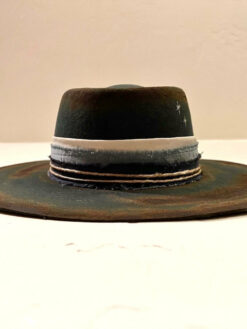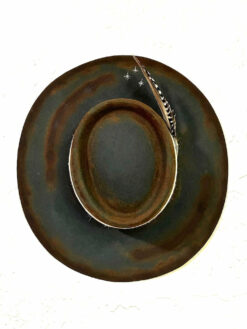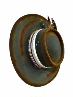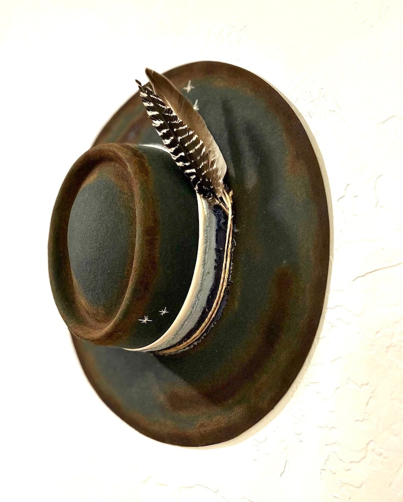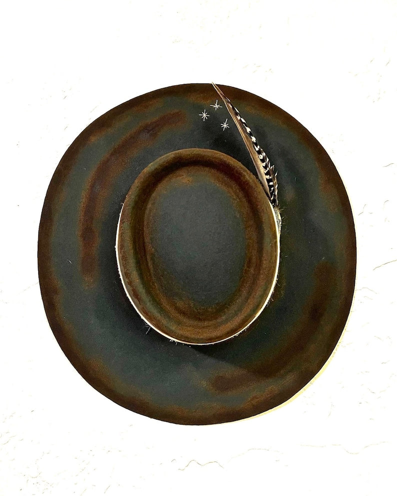 “Night Sky custom burned flat brim wool felt cowboy hat” is hand-distressed, hand-dyed, and hand-torched, ensuring no two share the same color or design. Each piece is uniquely imperfect, with subtle variations from product images.