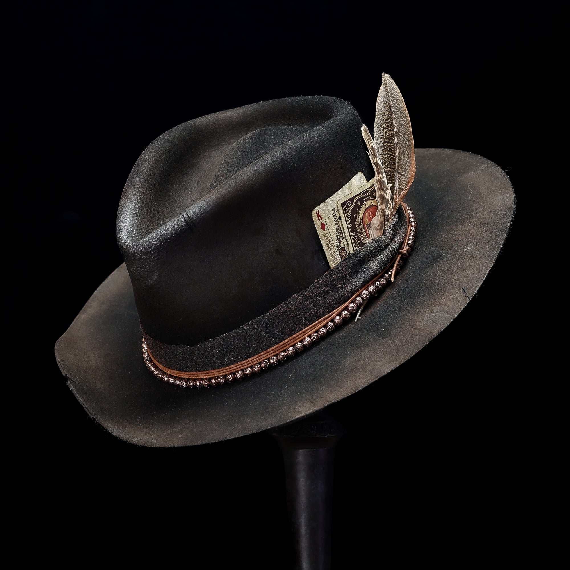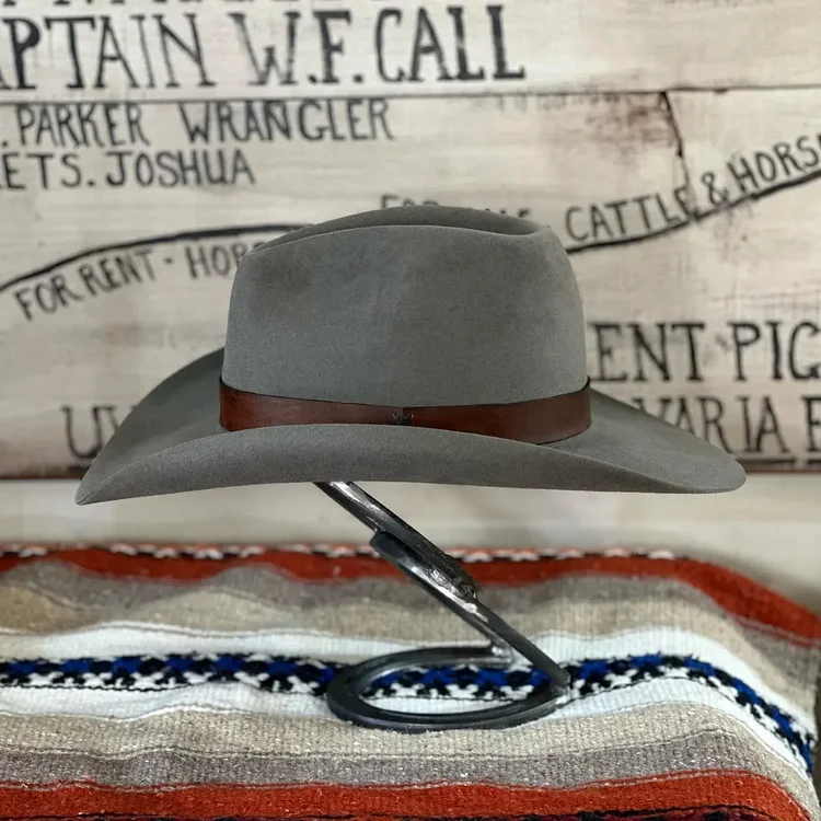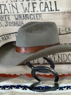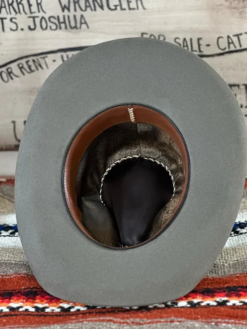 It has a low profile Gus creased crown that is 4.75″ in the back and slopes to 4.25″ in the front. The 3.75″ brim has a small pencil curl on the sides and a nice slope in the front and back. It is topped off with an antique looking leather hat band. We really like this one with its unique look and versatility.