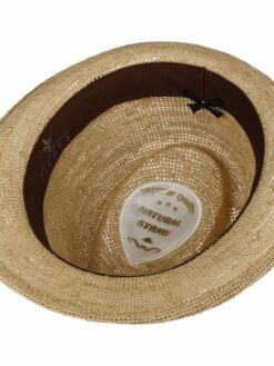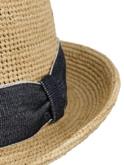 Made from 100% straw, this hat has an attractive crochet look and fits harmoniously into the summer leisure wardrobe. The chic hat can be flexibly combined with a linen suit or jeans and a T-shirt. A wide denim-look trim band with a contrasting braid gives the Italian-made straw hat a particularly casual look.