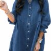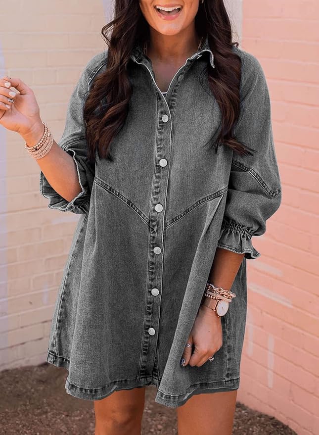- Sexy summer denim jeans mini dress with loose style, ruffles, buttoned down, smocked 3/4 long sleeve design add stylish aesthetic