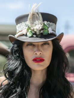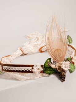 This goregous hatband uses a leather band as its base. The leather is srapped in lace which gives a touch of elegance. The leaves and feather on front paired with the skull make this hatband very unique.