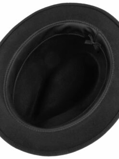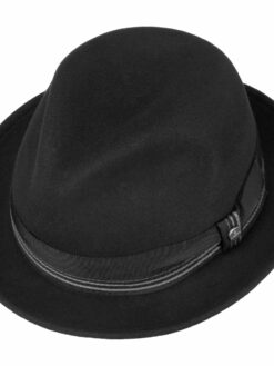 Supple wool felt gives this hat its pleasant feel and, together with a skin-friendly lining made of cotton, makes it comfortable to wear. The plain design of the felt hat with narrow brim is complemented by a subtly striped grosgrain ribbon trim with brand pin, which emphasises the hat’s neat charm. This trilby can be worn on everyday outings, but also makes a great club hat.